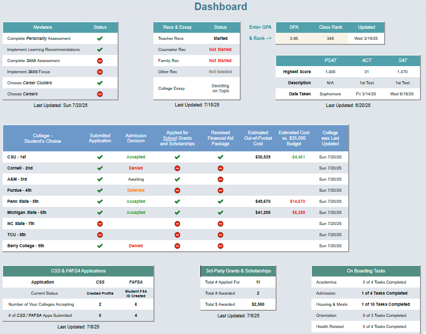 Build your family's College Puzzle using our web app built on Google Sheets with automation powered by Google Apps Script. The app lets you track information, activities and deadlines on all the steps of the process including ACT/SAT dates and scores, information on up to 15 colleges, scholarships, CSS/FAFSA, on-boarding activities after committing and it creates a Google College calendar for your family with integrated Gmail and text message reminders.